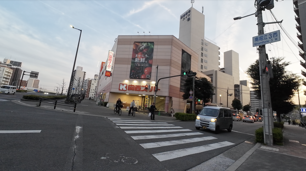 西堀江の地元エリアだけでも十分生活できますが、ちょっとした大きな買い物や遊びの用事があれば、チャリでパッとJR難波へ出られます。